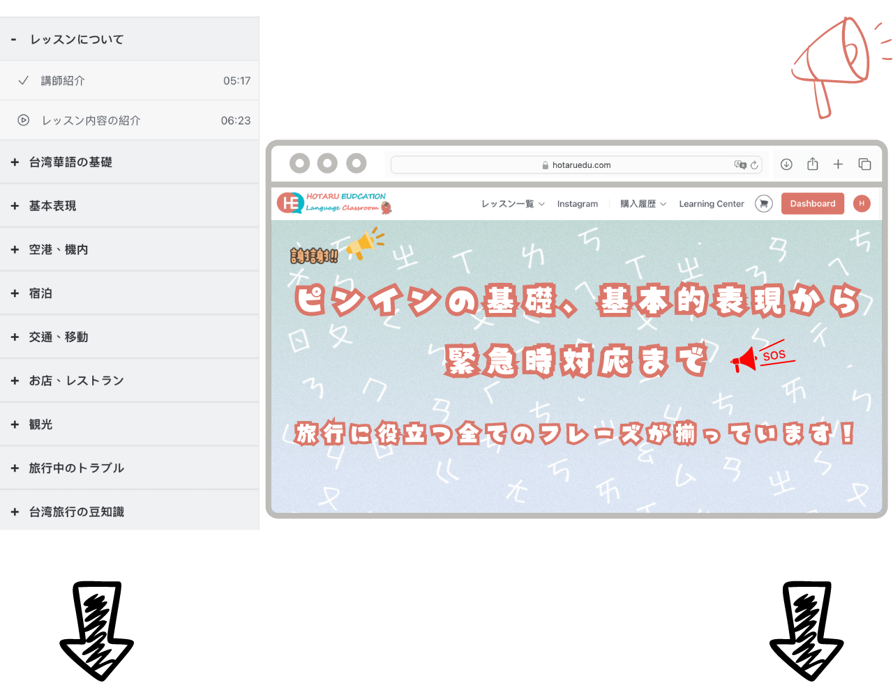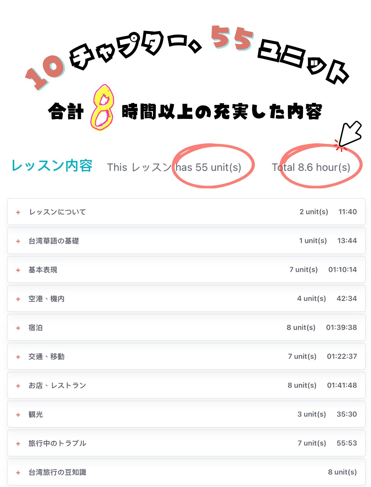 レッスン内容56 units in total•Total duration approximately 8.6 hours