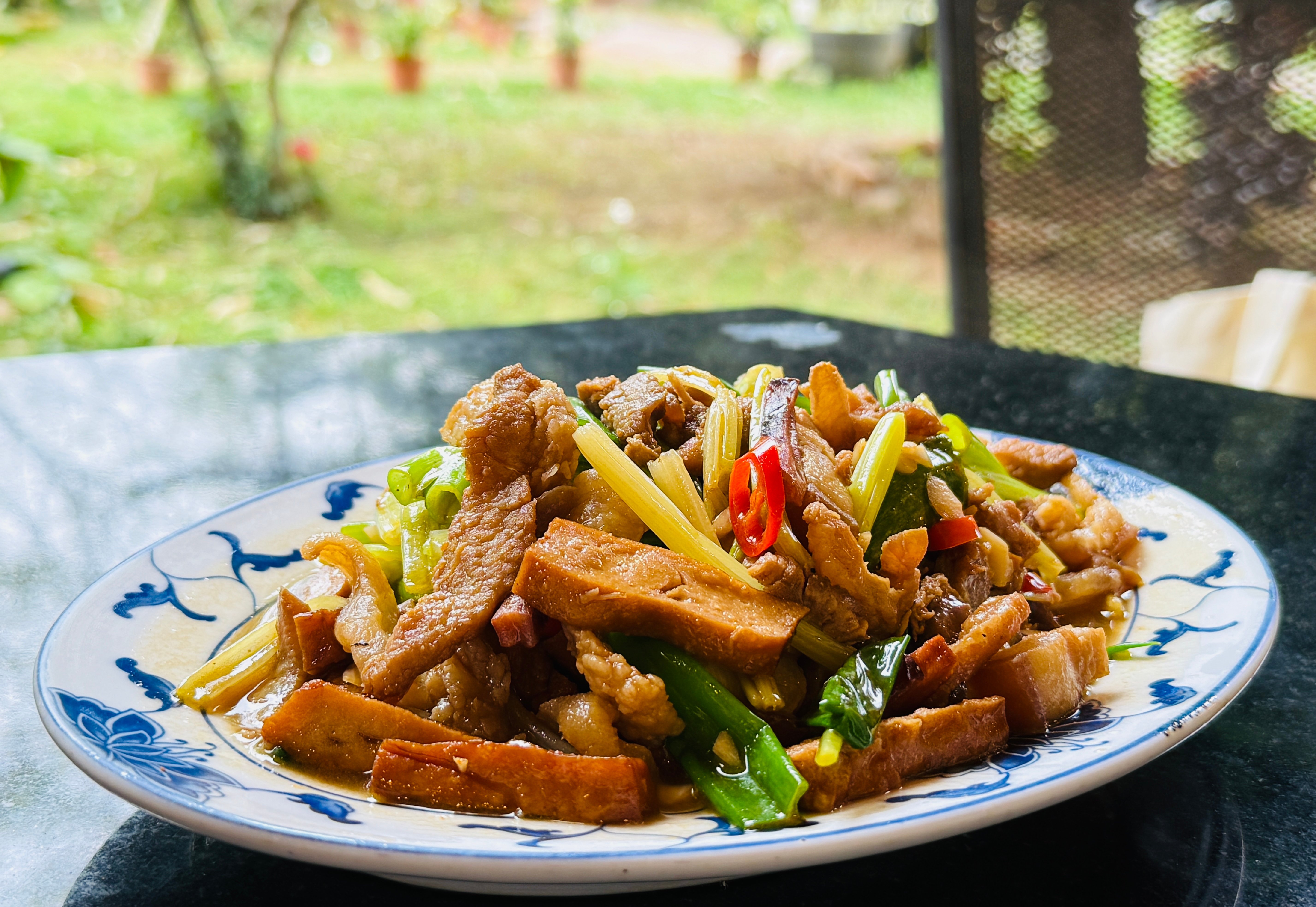 豚肉、豆干(固い豆腐)、セロリ、イカなどを強火で炒めた料理で、香ばしくて、とにかくご飯が進む味。